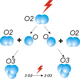 El ozono es una variedad alotrópica (inestable) del oxígeno, su molécula triatómica (O3) se genera por la activación de la molécula diatómica (O2) del oxígeno. Esta activación puede ser provocada por la acción de una descarga eléctrica o por la energía irradiada de los rayos ultravioleta. Se produce de manera natural en las altas capas de la atmósfera mediante la acción de los rayos.